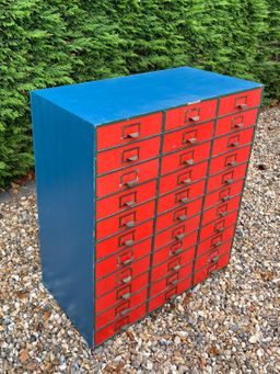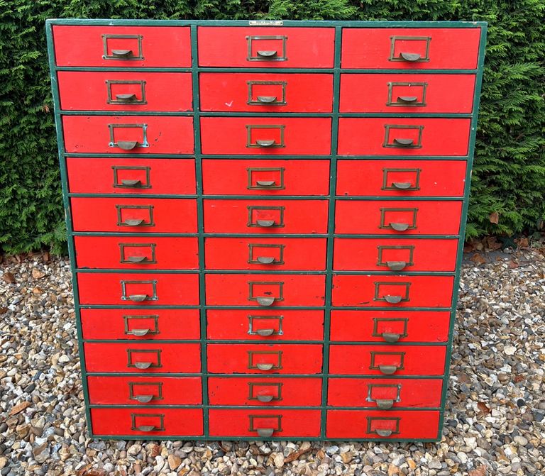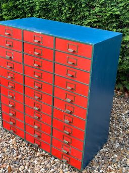 A vintage Shaw & Sons Stationery storage unit comprising of 33 trays. Shaw & Sons were established in 1750 manufacturing predominantly legal and paper printing products. The trays have thier original metal pulls and nameplates. Each tray has a wooden base with board sides. The front of each tray is also wood. Some of the trays have retained their original paper lining, most of sections of the lining missing. The item has been historically painted and has marks and wear commensurate with its age and previous use.