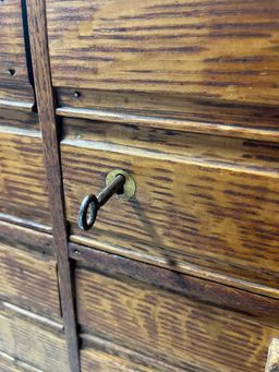 A great set of vintage oak drawers. One of the drawers has a working lock and key. The drawers have marks and wear commensurate with their age and previous use.