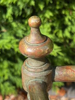 This is an impressive Victorian cast iron and brass book press. The book press is positioned on its original, bespoke mahogany stand which has two drawers, the top one of which locks with a key. On both sides of the stand there are side flaps supported on wooden, hinged stays. It is in fine antique condition with wear commensurate with age.